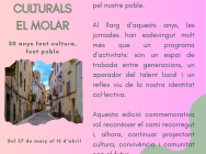 XXX JORNADES CULTURALS - El Molar 27 de març al 12 d’abril 2026 Xerrades, tallers, exposicions, presentacions de llibres, espectacles, música, cinema i moltes altres activitats per a totes les edats i gustos. Us esperem a la 30a edició de les Jornades Culturals!
