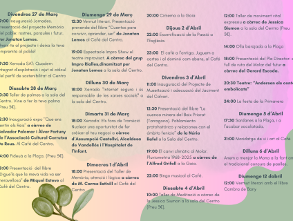 Xerrades, tallers, exposicions, presentacions de llibres, espectacles, música, cinema i moltes altres activitats per a totes les edats i gustos.